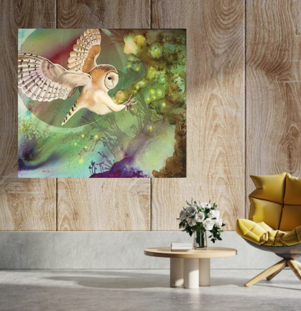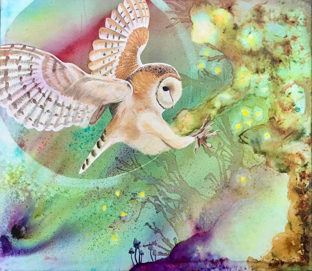 ‘The Fall Flight’ is the inaugural piece in the Spirit Animal series, a collection of channelled artworks that act as conduits for the wisdom and energy of various animal archetypes. This painting centres on the majesty of the barn owl, a creature steeped in symbolism throughout history, particularly Celtic and Welsh mythology.