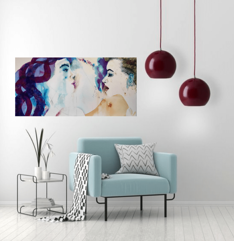‘Proximity’ captures a tender moment between two women, depicted with vibrant hues and water-colour mark making that enhance the emotional depth of the moment.